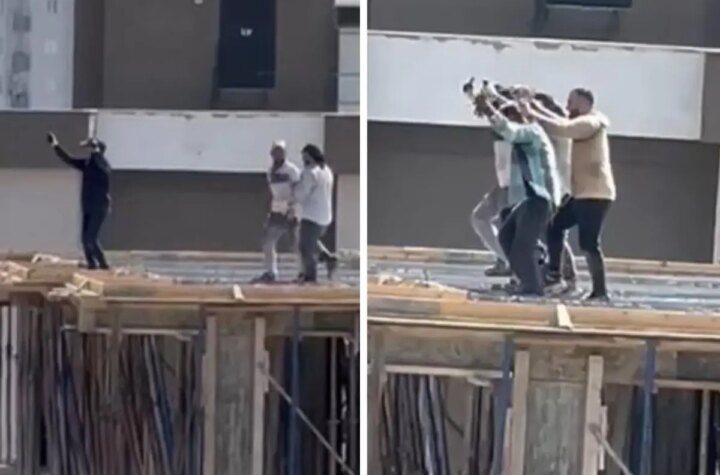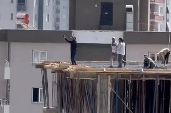 Adana'da bir inşaatın 10. katında çalışan personeller, arabadan gelen müzik sesiyle halay çekmeye başladı....